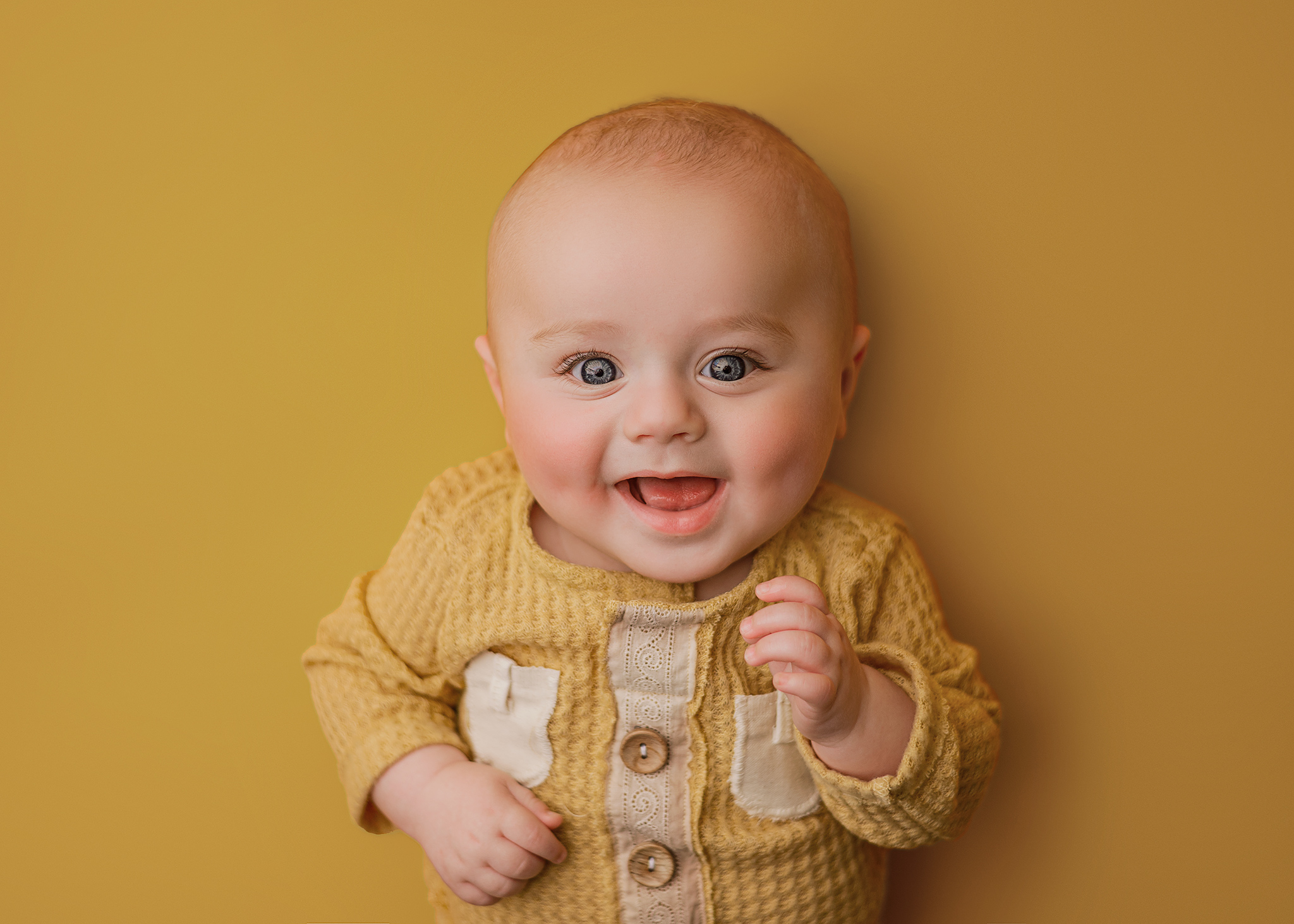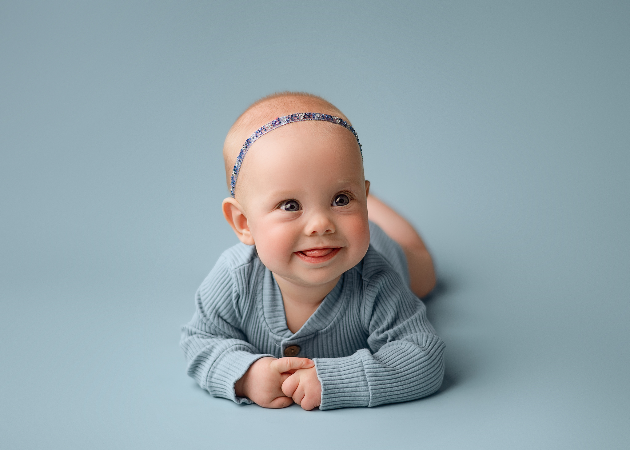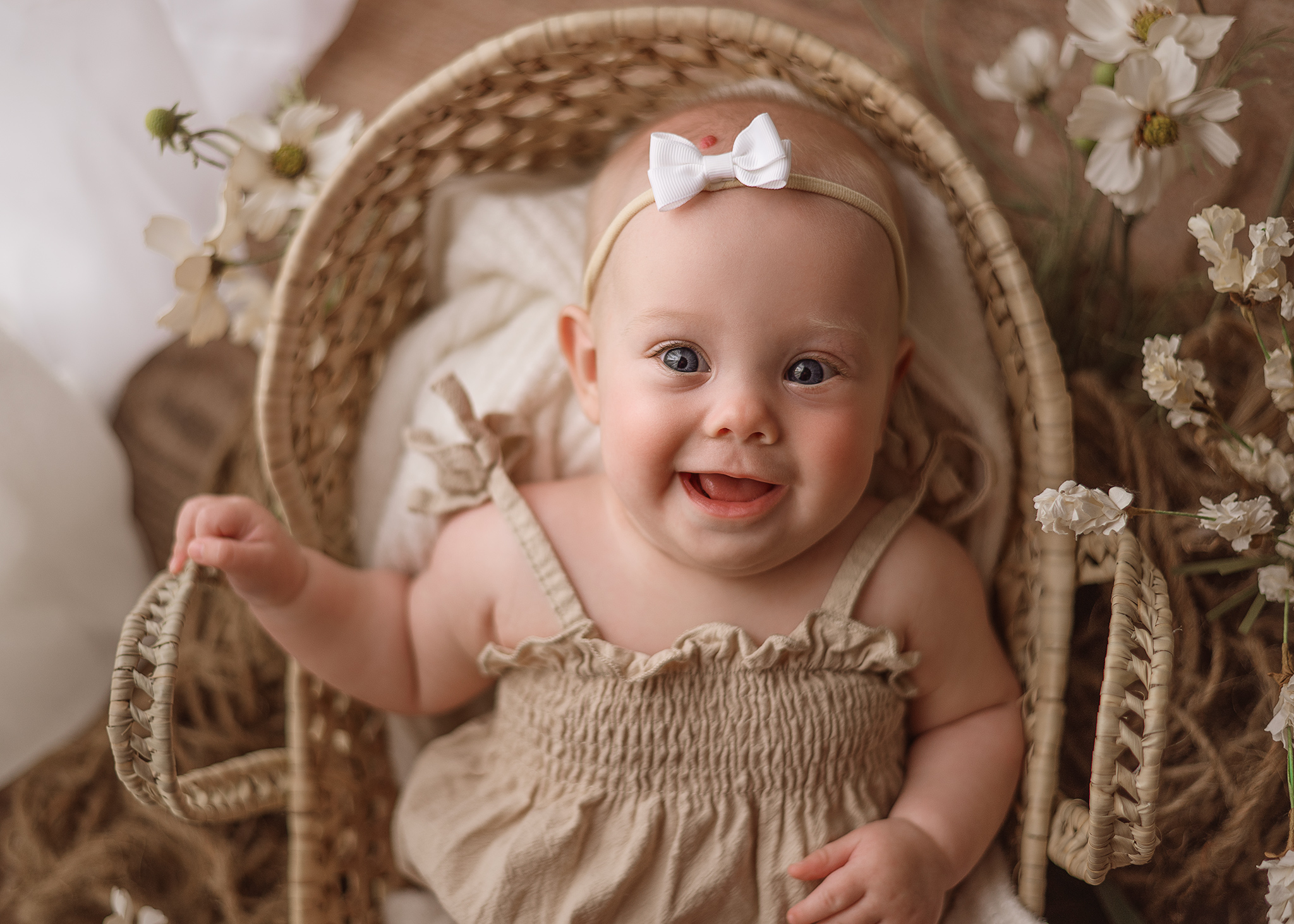 At the six month baby photography milestone session, your little one will be just about sitting unassisted. If they are not sitting unassisted I have age-appropriate props that we will use such as bucks or bowls. Even them just laying playing with their feet or blowing spit bubbles are images you will cherish.