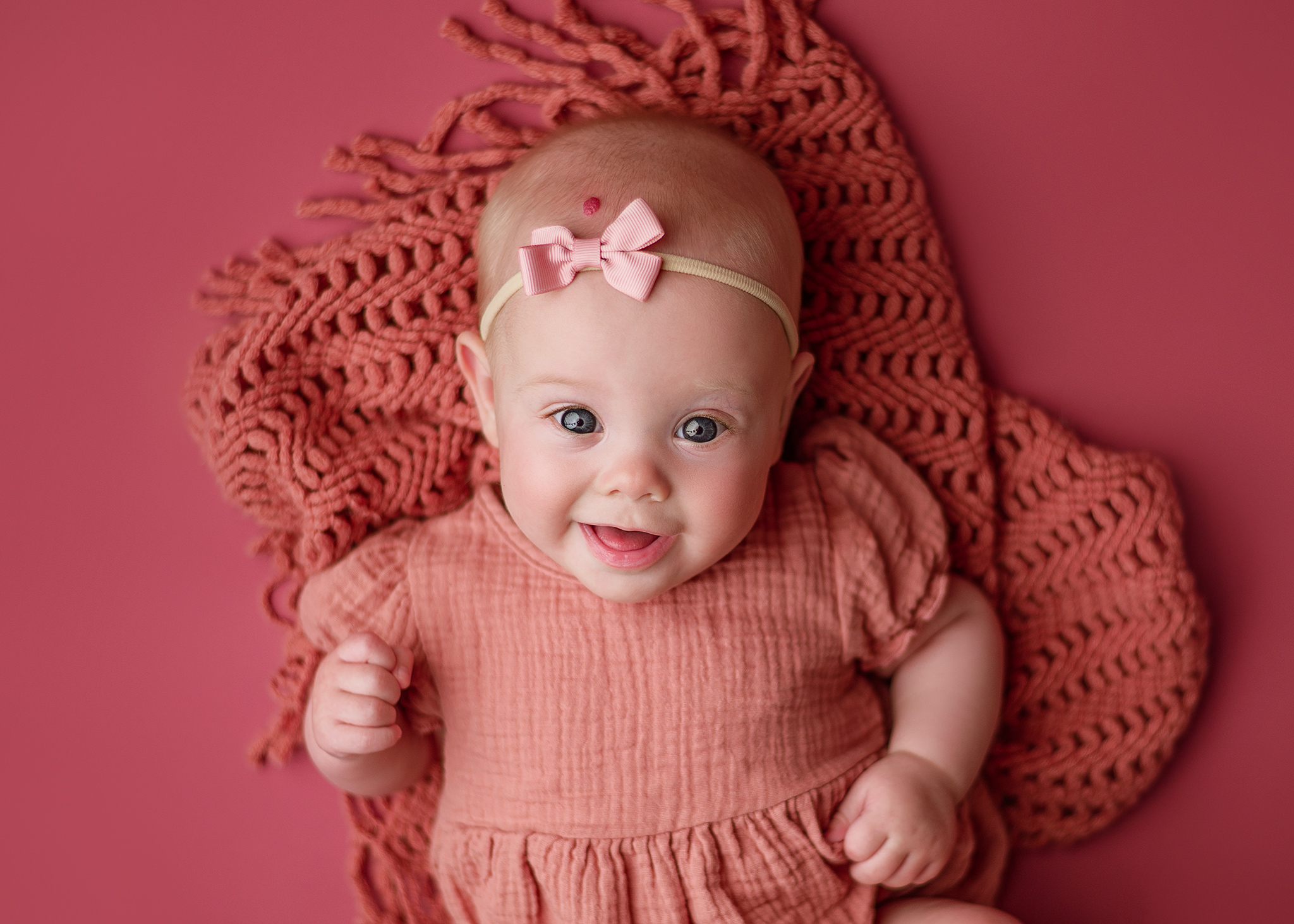 During a three month milestone session, babies are photographed on their back. Typically at this age they have great eye contact, they have better neck and head control and maybe even sometimes social smiling. If able to hold their head up we will get some tummy time photos as well.